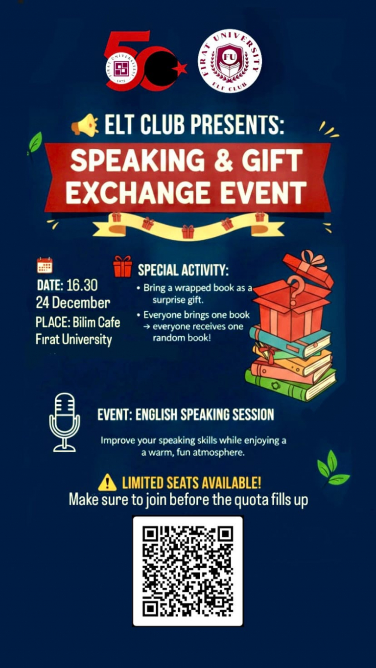 ELT Club tarafından düzenlenen İngilizce Konuşma Oturumu ve Kitap Hediye Değişim Etkinliği, 24 Aralık tarihinde saat 16.30’da Fırat Üniversitesi Bilim Kafe’de gerçekleştirilecektir. Etkinlik kapsamında katılımcılar, samimi ve akademik bir ortamda İngilizce konuşma becerilerini geliştirme fırsatı bulurken, aynı zamanda kitap hediye değişimi etkinliğine katılacaktır.