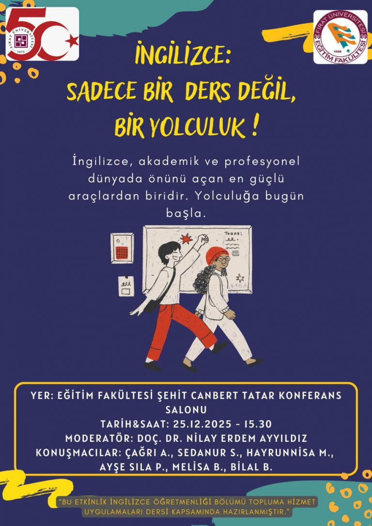 Bölümümüz 4. sınıf öğrencileri, yürütücülüğünü Doç. Dr. Nilay ERDEM AYYILDIZ’ın üstlendiği Topluma Hizmet Uygulamaları dersi kapsamında, İngilizcenin akademik ve profesyonel hayattaki önemini vurgulamak amacıyla “İngilizce: Sadece Bir Ders Değil, Bir Yolculuk!” başlıklı bir söyleşi gerçekleştireceklerdir. Etkinlik, 25 Aralık 2025 tarihinde saat 15.30’da Eğitim Fakültesi Şehit Canbert Tatar Konferans Salonu’nda düzenlenecektir.