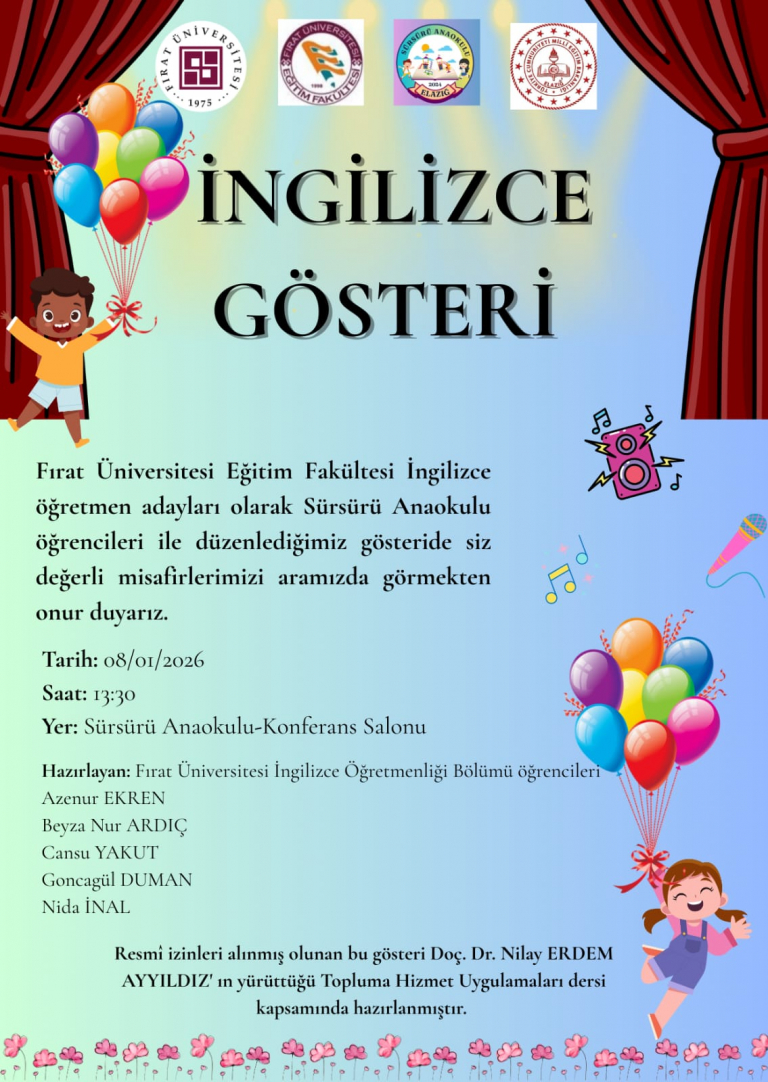 Yürütücülüğünü Doç. Dr. Nilay ERDEM AYYILDIZ’ın üstlendiği Topluma Hizmet Uygulamaları dersi kapsamında, 4. sınıf öğrencilerimiz tarafından 8 Ocak Perşembe günü saat 13.30’da Sürsürü Anaokulunda, anasınıfı öğrencileriyle birlikte hazırlanan bir İngilizce Gösterisi düzenlenecektir.