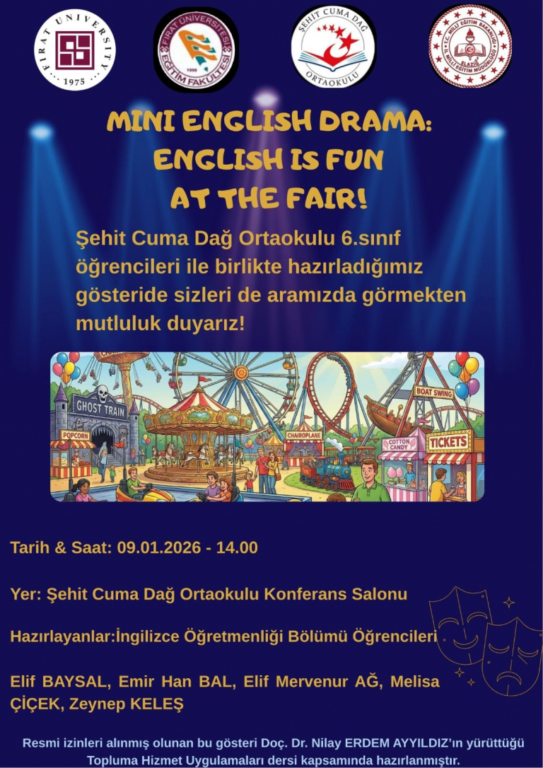 Ayrıca, başka bir grup öğrencimiz tarafından 9 Ocak Cuma günü saat 14.00’te Şehit Cuma Dağ Ortaokulunda, 6. sınıf öğrencileriyle birlikte hazırlanan “Mini English Drama: English Is Fun at the Fair” adlı gösteri sahnelenecektir.
