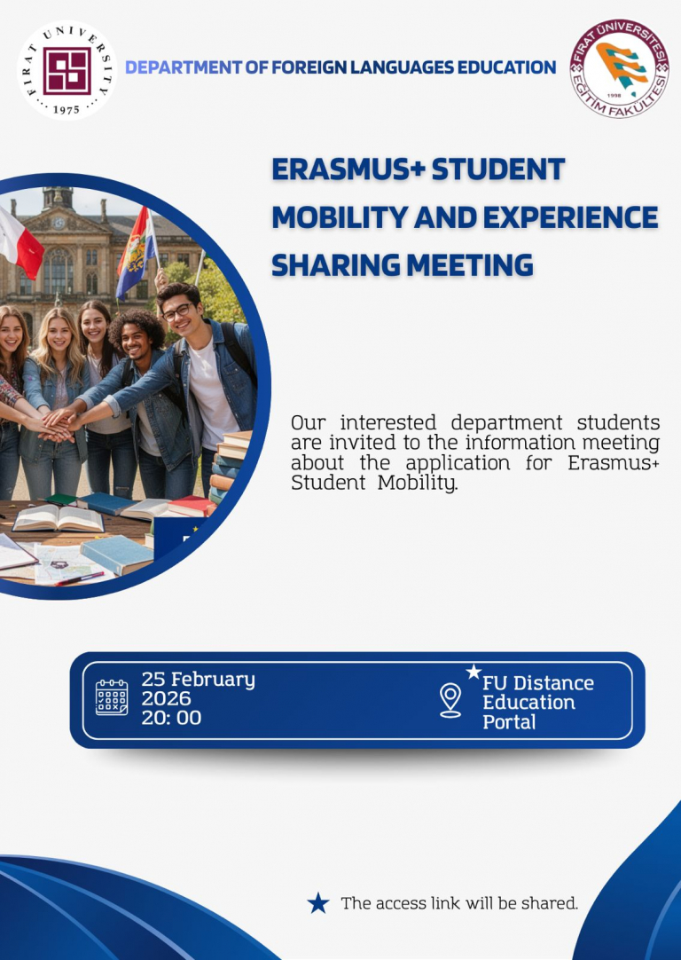 Erasmus+ Öğrenci Hareketliliği başvuru sürecine ilişkin bilgilendirme ve deneyim paylaşımı toplantısı düzenlenecektir. Erasmus+ programına başvurmayı düşünen veya bu konuda bilgi almak isteyen bölümümüz öğrencilerinin katılımı beklenmektedir.