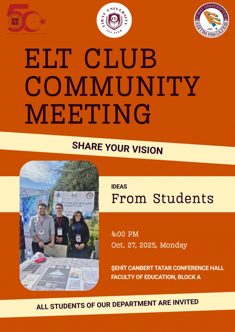 Bölümümüz öğrenci kulübü ELT Club olarak, yeni dönem topluluk toplantımıza tüm öğrencilerimizi davet ediyoruz!