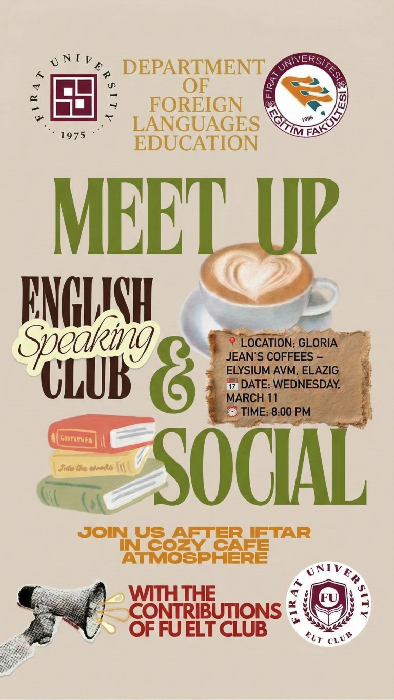 Bölümümüz ve bölüm öğrenci topluluğumuz FU ELT Club katkılarıyla, öğrencilerimizin İngilizce konuşma pratiği yapabilecekleri ve sosyal bir ortamda bir araya gelebilecekleri English Speaking Club & Social Meet-Up etkinliği düzenlenecektir.